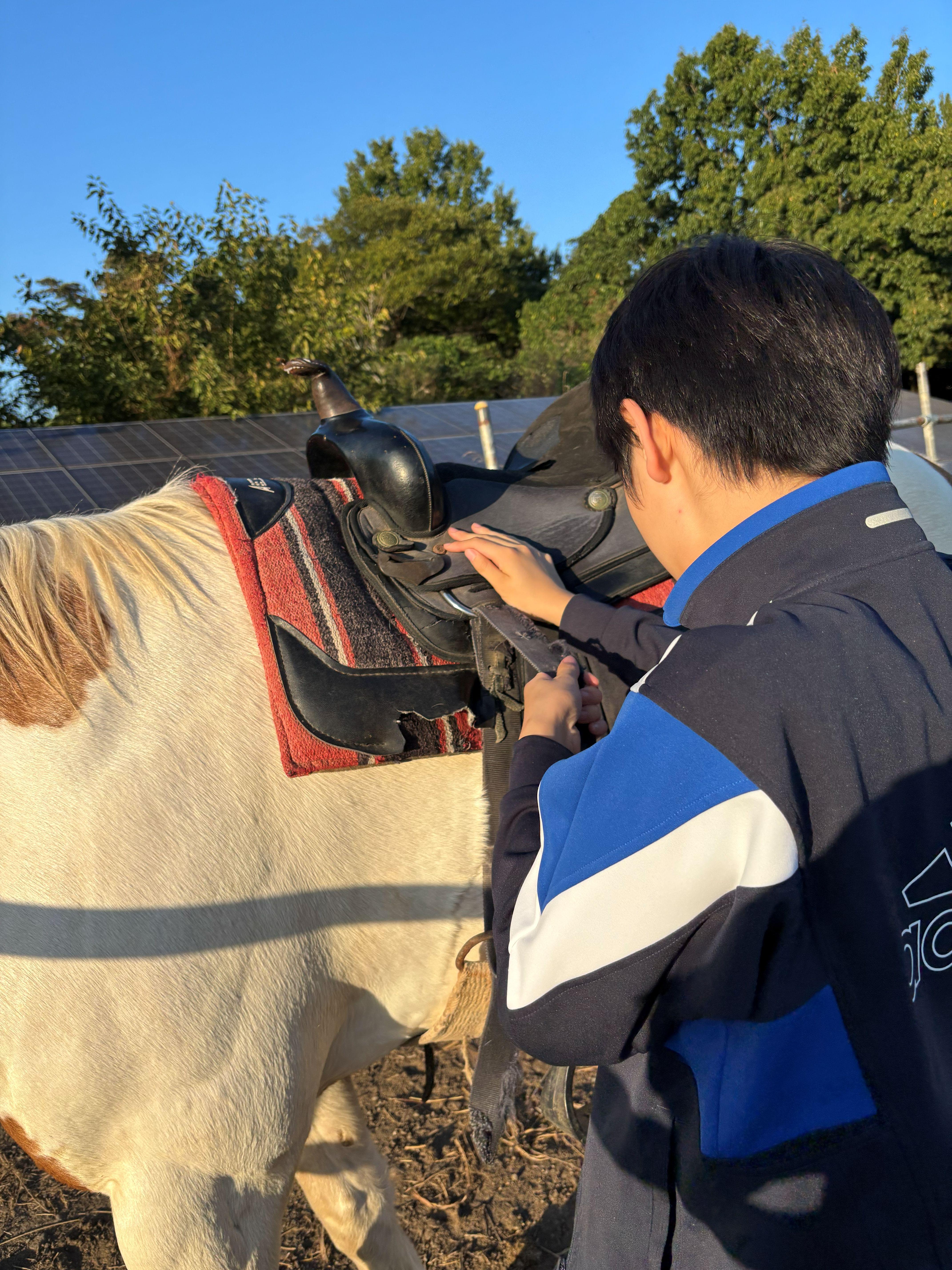必要に応じて鞍(くら)や頭絡(とうらく)を装着します。この「馬装」の時間は、馬と自分の気持ちを整える共同作業です。